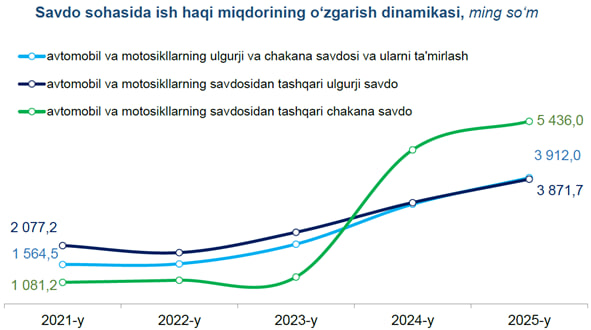 Farg‘ona viloyati statistika boshqarmasining bergan ma’lumotiga ko‘ra, 2025-yil 1-aprel holatiga, savdo sohasida o‘rtacha oylik ish haqi 4 865,1 ming so‘mni tashkil etgan bo‘lsa
