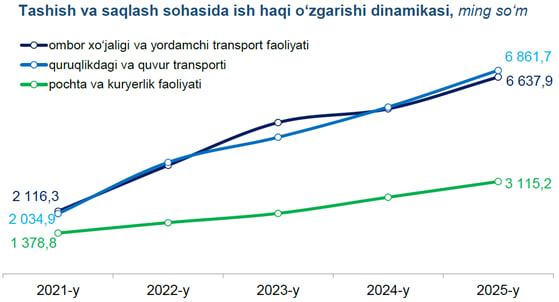 Farg‘ona viloyati statistika boshqarmasining bergan ma’lumotiga ko‘ra, 2025-yilning yanvar-mart oylari holatiga Farg‘ona viloyatida tashish va saqlash sohasida o‘rtacha oylik ish haqi 6 318,5 ming so‘mni tashkil etgan