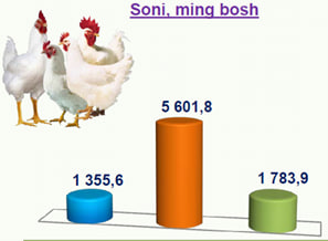 2025- yilning 1-aprel holatiga koʻra, barcha toifadagi xoʻjaliklarda parrandalar bosh soni 8 741,3 mingtaga yetdi. 2024-yilning mos davri bilan solishtirganda 101,5 % ni tashkil etdi.