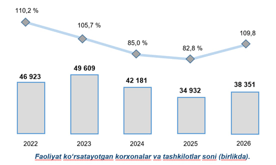 2026- yil 1- fevral holatiga koʻra, viloyatda faoliyat koʻrsatayotgan korxonalar va tashkilotlar soni (dehqon va fermer xoʻjaliklari bundan mustasno) 38,4 mingtani tashkil etadi.