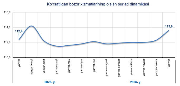 Farg‘ona viloyati statistika boshqarmasining bergan ma'lumoytiga ko‘ra, 2025- yilning yanvar oyiga nisbatan (1 033,8 ming so‘m) 2026- yilning mos davrida aholi jon boshiga ko‘rsatilgan bozor xizmatlari hajmi 223,0 ming so‘mga yoki 111,4 % ga o‘sdi.