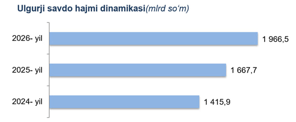 Farg‘ona viloyati statistika boshqarmasining ma'lumotiga ko‘ra, 2026- yil 1- fevral holatiga Farg‘ona viloyatida ulgurji savdo sohasida faoliyat ko‘rsatayotgan tijorat korxonalari soni 4 306 tani tashkil etib, shundan, faoliyat ko‘rsatayotgan yirik korxonalar soni 29 tani, kichik korxona va mikrofirmalar soni 4277 tani tashkil qildi.