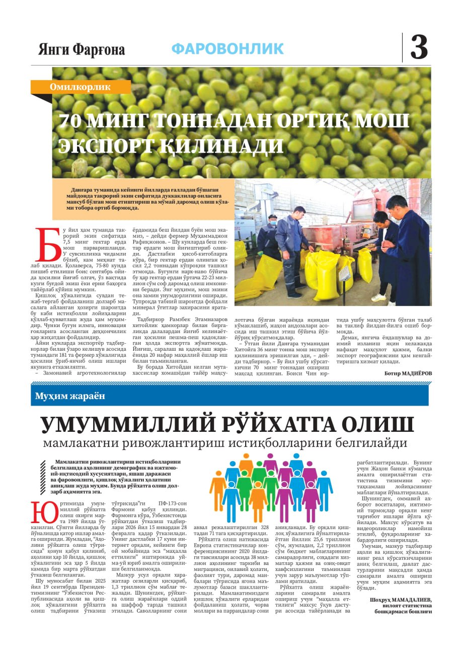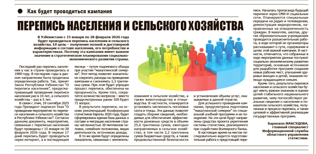 Farg‘ona viloyati statistika boshqarmasi Axborot xizmati bosh mutaxassisi B. Maksudovaning "Новая Фергана" gazetasi (2025-yil 2-oktabr 37-soni)da "Перепись населения и сельского хозяйства" sarlavha ostida maqolasi chop etildi.