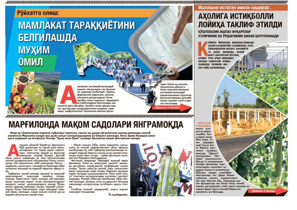 Farg‘ona viloyati statistika boshqarmasi boshlig‘i Sh.Mamadaliyevning "Yangi Farg‘ona" gazetasi (2025-yil 4-oktabr 80-soni)da "Umummilliy ro‘yxatga olish mamlakatni rivojlantirish istiqbollarini belgilaydi" sarlavha ostida maqolasi chop etildi.