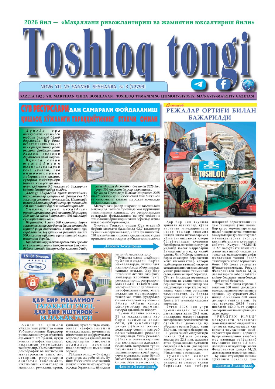 "Toshloq tongi" gazetasining yangi sonida Toshloq tumani statistika bo‘limi boshlig‘i R.Umarovning "Har bir ma'lumot - taraqqiyot uchun, har bir ishtirok - kelajak uchun" sarlavhali maqolasi chop etildi.