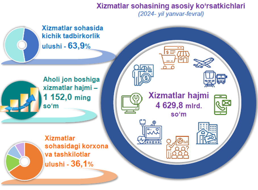 2024- yilning yanvar-mart oylari yakunlariga ko‘ra, Farg‘ona viloyatida savdo, yashash va ovqatlanish xizmatlari sohasida 1 318,4 mlrd. so‘m miqdorda qo‘shilgan qiymat yaratilgan bo‘lib,