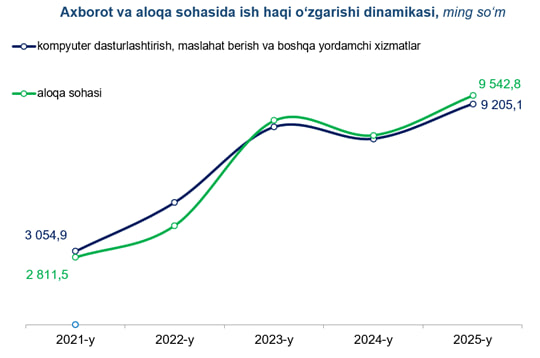 Farg‘ona viloyati statistika boshqarmasi bergan ma'lumotiga ko‘ra, Farg‘ona viloyatida axborot va aloqa sohasida o‘rtacha oylik ish haqi 9 028,7 ming so‘mni tashkil etgan