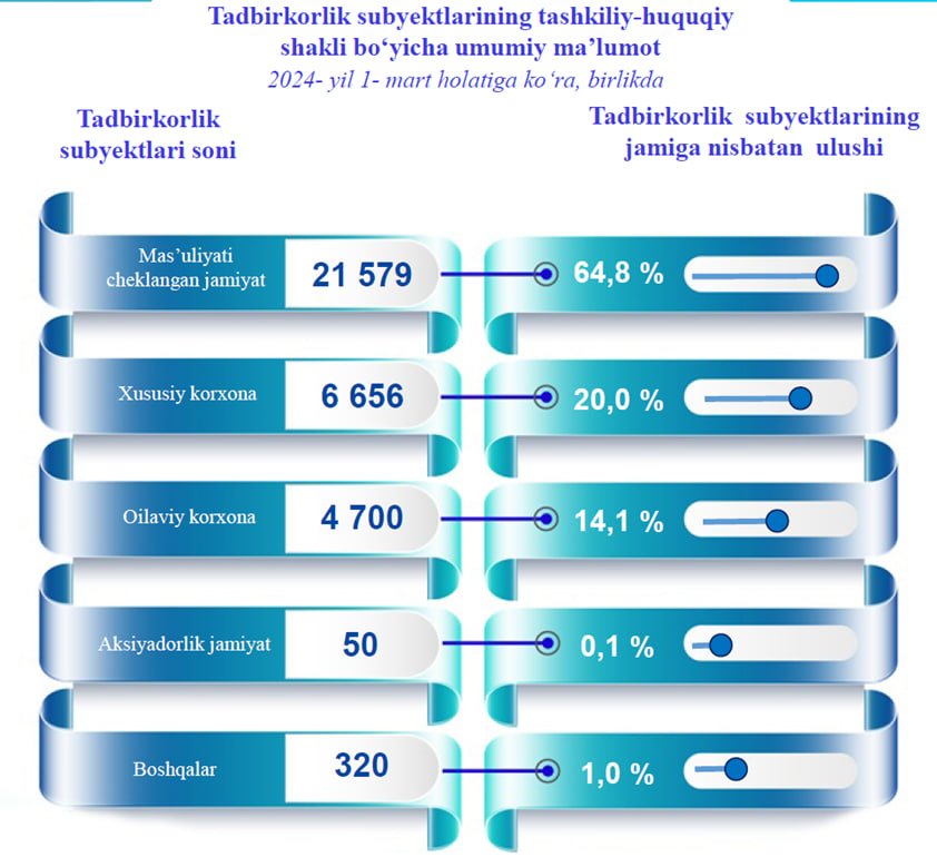 2024-yil 1-mart holatiga Farg‘ona viloyatida tadbirkorlik subyektlarning tashkiliq-huquqiy shakli bo‘yicha korxonalar soni e'lon qilindi.