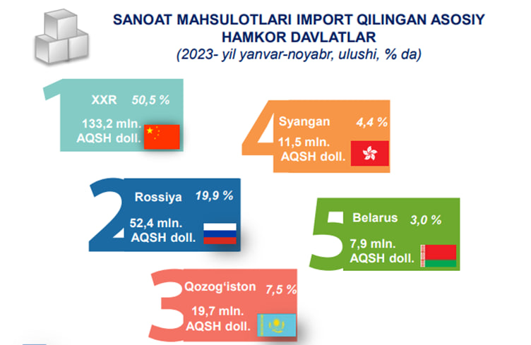 2023- yil yanvar-noyabr oylarida import tarkibida sanoat mahsulotlari tovarlari hajmi 263,7 mln. AQSH dollarini tashkil etdi.