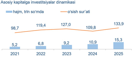 Farg‘ona viloyati statistika boshqarmasining bergan ma’lumotiga ko‘ra, 2025-yil 1-iyul holatiga Farg‘ona viloyatida so‘nggi besh yildagi asosiy kapitalga investitsiyalar hajmi deyarli 2,9 barobarga ko‘paydi, ayniqsa joriy davrda o‘tgan yilga nisbatan 4,4 trln so‘mga ko‘p investitsiyalar o‘zlashtirildi.