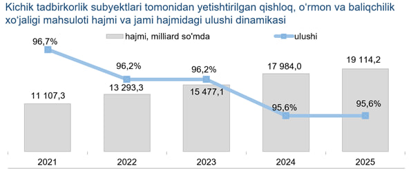 2025- yil yanvar-iyun oylarida kichik tadbirkorlikning qishloq, o‘rmon va baliqchilik xo‘jaligidagi hajmi 19 114,2 mlrd so‘mni yoki umumiy hajmidagi ulushi 95,6% ni tashkil etdi.