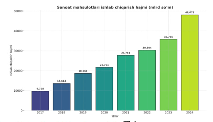 Farg‘ona viloyati statistika boshqarmasi bergan ma'lumotiga ko‘ra2025-yil yanvar-iyun oylari holatiga viloyatda sanoat ishlab chiqarish hajmi 26 707,0 mlrd so‘m miqdorida qayd etilib