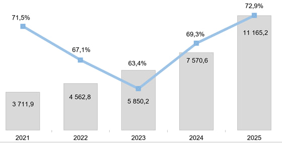 2025- yil yanvar-iyun oylarida kichik tadbirkorlik subyektlari tomonidan asosiy kapitalga o‘zlashtirilgan investitsiyalar hajmi 11 165,2 mlrd so‘mni yoki umumiy hajmidagi ulushi 72,9 % ni tashkil etdi.