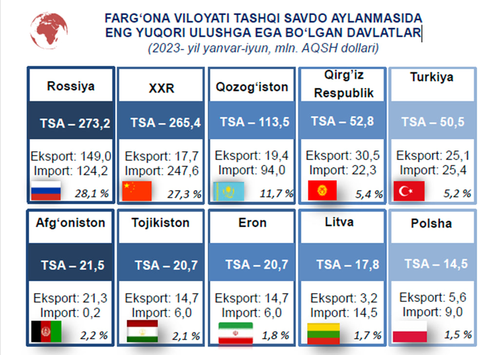 Farg‘ona viloyati jahonning 75 mamlakat bilan savdo aloqalarini amalga oshirib kelmoqda.