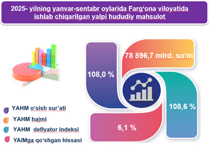 Dastlabki ma’lumotlarga ko‘ra, 2025- yilning yanvar-sentabr oylarida Farg‘ona viloyati bo‘yicha yalpi hududiy mahsulot (keyingi o‘rinlarda – YAHM) hajmi joriy narxlarda 78 896,7 mlrd so‘mni tashkil etdi