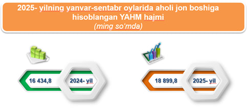 Farg‘ona viloyati statistika boshqarmasining bergan ma’lumotiga ko‘ra,2025- yilning yanvar-sentabr oylarida Farg‘ona viloyati bo‘yicha aholi jon boshiga hisoblangan YAHM hajmi 18 899,8 ming so‘mni tashkil etdi