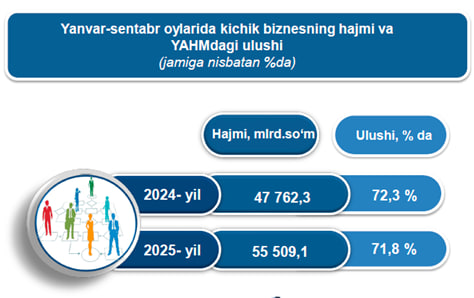 2025-jyilning yanvar-sentabr oylarida kichik tadbirkorlik 55 509,1mlrd so‘mni tashkil etdi (2024- yilning yanvar-sentabr oylarida - 47 762,3 mlrd so‘m). YAHMdagi ulushi 71,8 % ni (2024- yilning yanvar-sentabr oylarida – 72,3 %) tashkil qildi.