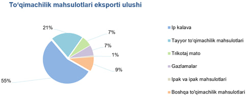 Farg‘ona viloyati statistika boshqarmasining bergan ma'lumotiga ko‘ra, 2025-yil yanvar-may oylari holatiga Frg‘ona viloyatida 103,2 mln AQSH dollarilik to‘qimachilik mahsulotlari eksporti amalga oshirilib, umumiy eksportning 36,6 % ini tashkil etdi