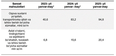 Farg‘ona viloyati statistika boshqarmasining bergan ma'lumotiga ko‘ra, 2025-yil yanvar-may oylari holatiga Farg‘ona viloyatida suv bilan ta’minlash, kanalizatsiya tizimi, chiqindilarni yig‘ish va utilizatsiya qilish korxonalari tomonidan