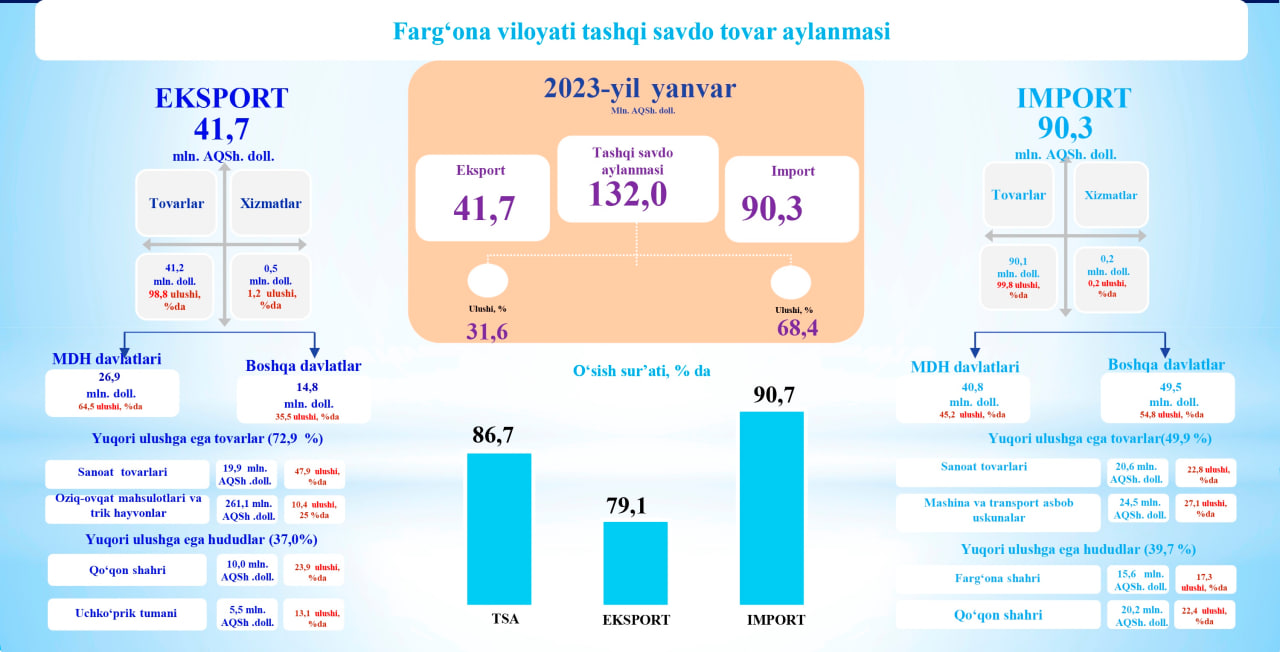 2023-yil yanvar oyi holatiga viloyat bo‘yicha ulgurji savdo tovar aylanmasi 567,3 mlrd. so‘mni tashkil etib, 2022-yilning mos davriga nisbatan 101,1 %ga o‘sdi.