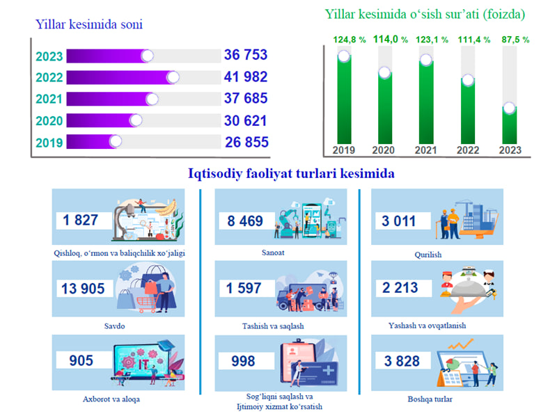 2023- yil 1- may holatiga faoliyat ko‘rsatayotgan tadbirkorlik subyektlari soni 36,7 mingtaga yetib, 2019- yilning mos davriga nisbatan o‘sish sur’ati 136,9 foizni tashkil etdi.