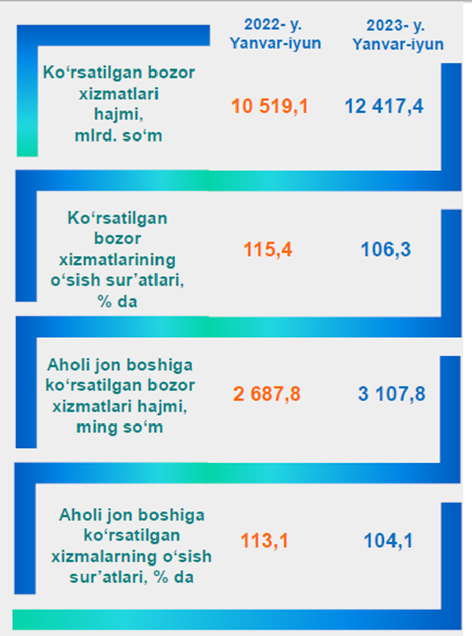 Dastlabki ma’lumotlarga ko‘ra, 2023-yilning yanvar-iyun oylarida ko‘rsatilgan bozor xizmatlari hajmi 1 898,3 mlrd. so‘mga oshib, 12 417,4 mlrd. so‘mga yetdi. Taqqoslama ekvivalentda 2022- yilning yanvar-iyun oyilariga (115,4 %) nisbatan o‘sish sur’ati 106,3 % ni tashkil etdi.