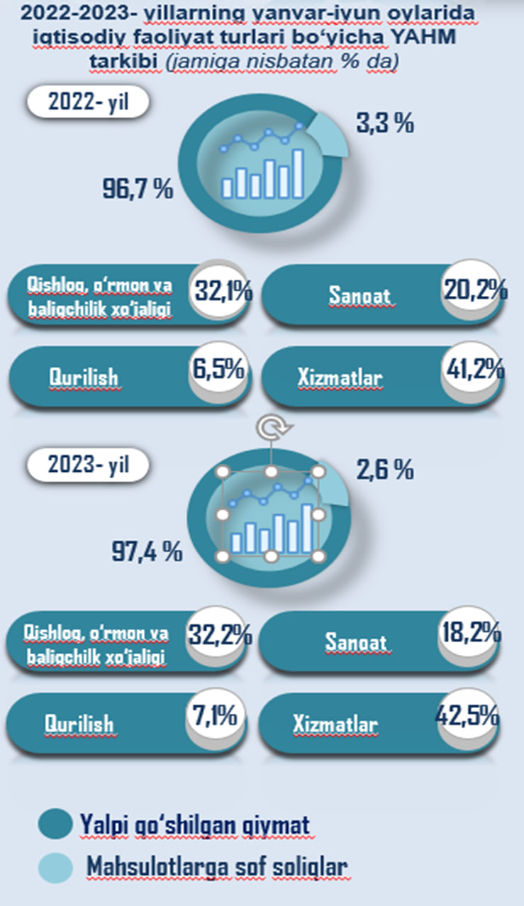 2023-yilning yanvar-iyun oylarida hudud iqtisodiyotining barcha tarmoqlarida yaratilgan yalpi qo‘shilgan qiymat hajmi umumiy YAHMning 97,4 %ini, mahsulotlarga sof soliqlar esa 2,6 %ini tashkil etdi.