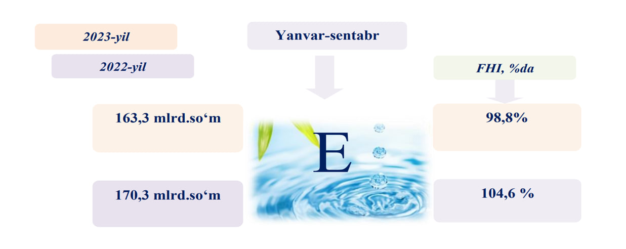 2023-yil yanvar-sentabr oylari holatiga Farg‘ona viloyati bo‘yicha suv bilan ta’minlash, kanalizatsiya tizimi, chiqindilarni yig‘ish va utilizatsiya qilish korxonalari tomonidan ishlab chiqarilgan mahsulotlar hajmi 163,3 mlrd.so‘mni tashkil etdi.