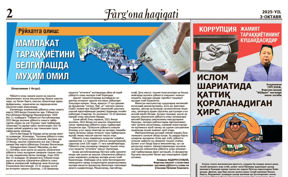 Farg‘ona viloyati statistika boshqarmasi Ro‘yxatga olish jarayonlarini tashkil qilish va o‘tkazish bo‘limi boshlig‘I A. Abdurazakovning "Farg‘ona haqiqati" gazetasi (2025-yil 3-oktabr 40-soni)da "Mamlakat taraqqiyotini belgilashda muhim omil" sarlavha ostida maqolasi chop etildi.