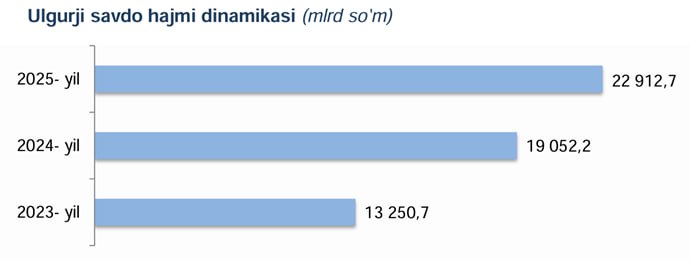 Farg‘ona viloyati statistika boshqarmasi bergan ma'lumotiga ko‘ra, 2025- yil 1- noyabr holatiga ulgurji savdo sohasida faoliyat ko‘rsatayotgan tijorat korxonalari soni 4 282 tani tashkil etib, shundan, faoliyat ko‘rsatayotgan yirik korxonalar soni 29 tani, kichik korxona va mikrofirmalar soni 4 253 tani tashkil qildi.