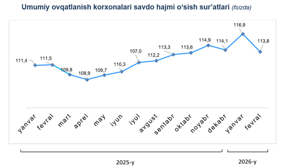 Farg‘ona viloyati statistika boshqarmasi bergan ma'lumotiga ko‘ra, 2026- yilning yanvar-fevral oyida ovqatlanish korxonalarining savdo aylanmasi 3 464,1 mlrd so‘mga yetdi. 2025- yilning mos davriga nisbatan 13,8 % ga oshdi. Bunda savdo aylanmasining 94,2 % ulushi kichik biznes va xususiy tadbirkorlik subyektlari hissasiga to‘g‘ri keldi.